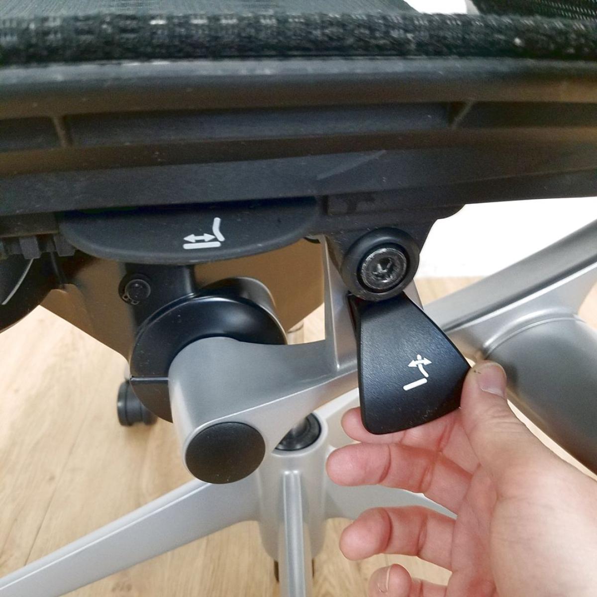 座面の前後スライド調整(前後50mm)は、両手を自然に下ろした位置にあるレバーで簡単に操作できます。