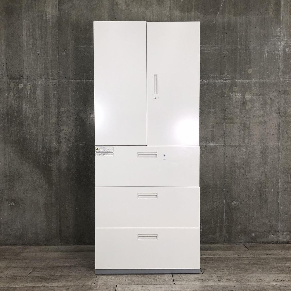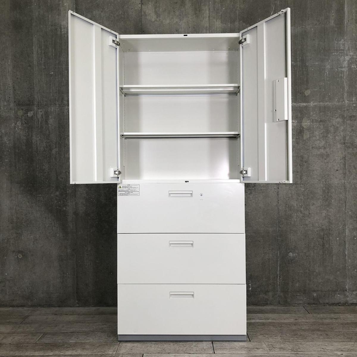 【大容量の上下書庫セット!オフィス書類を一気に整理!】■プラス(PLUS)製 L6シリーズ 両開き戸+3段ラテラル 書庫セット H2150㎜ ■ホワイト ■シリンダー錠- 名古屋本店