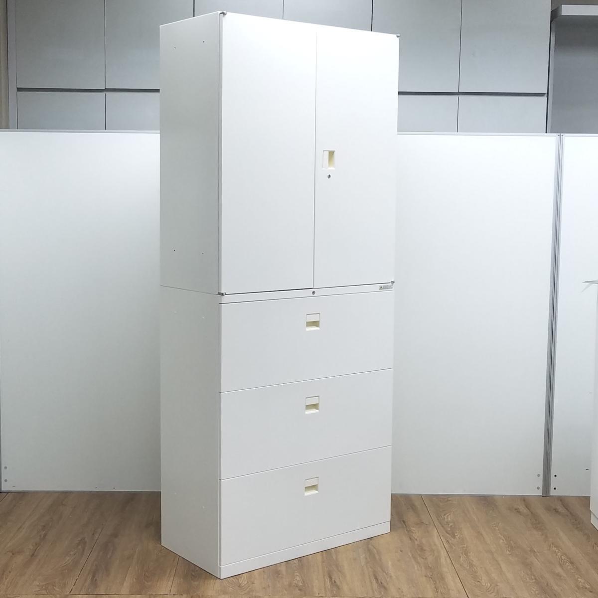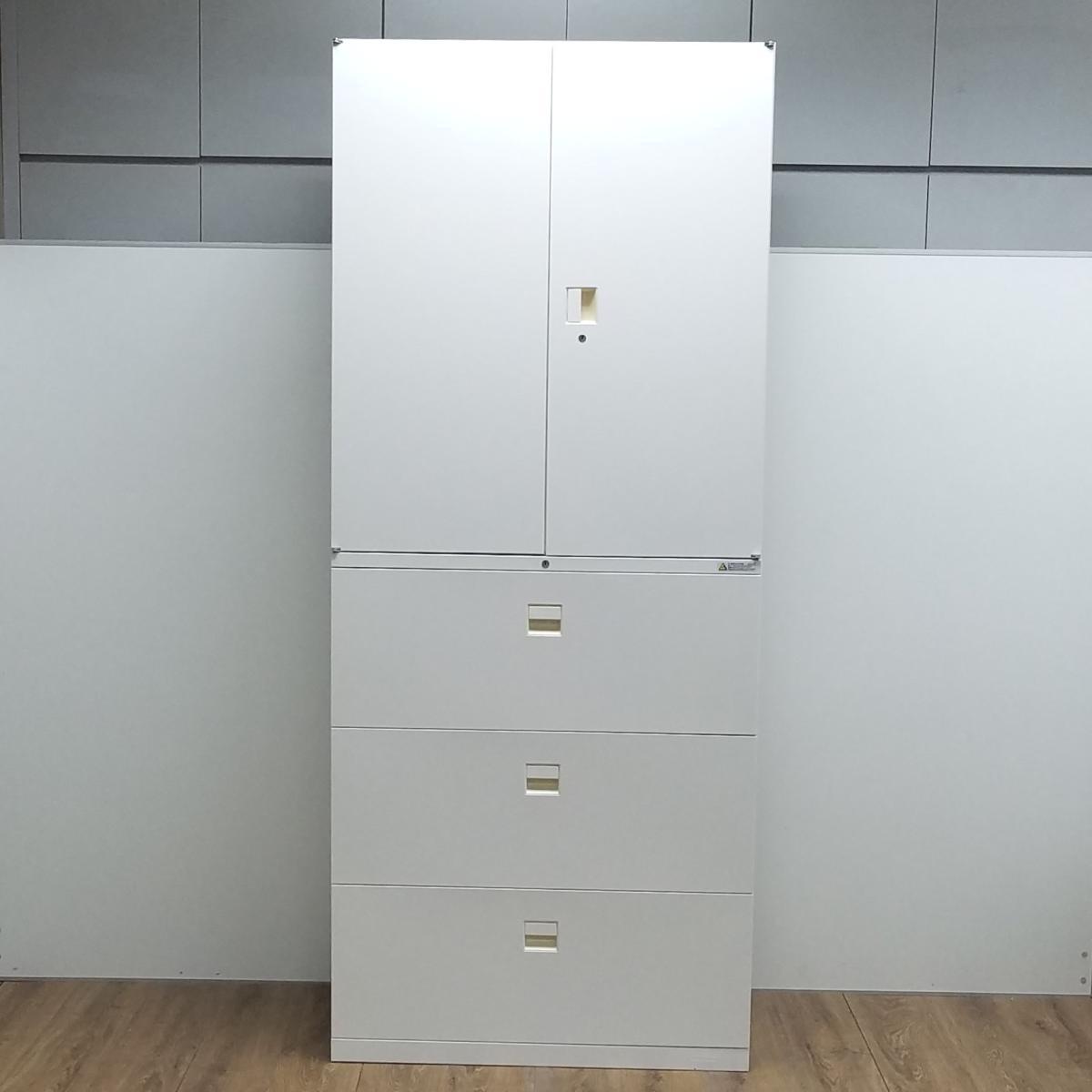 【オフィスの人気シリーズ!観音開き+引き出し仕様!書類整理におすすめ!】/オススメ(おすすめ) /人気商品【弊社使用欄:A01058768 / A01058766】■オカムラ(okamura)製 SAデュオライン 書庫セット 両開き+3段ラテラル ■シリンダー錠 ■ホワイト
