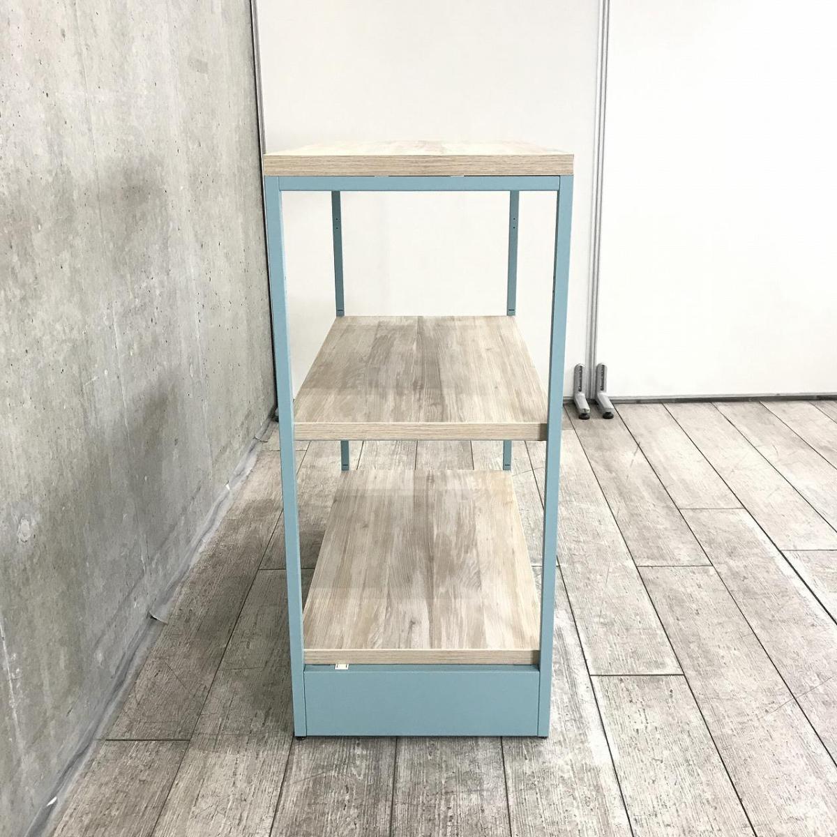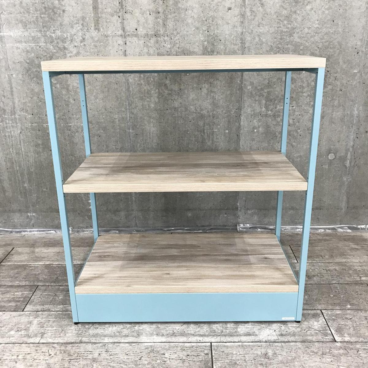【オシャレに収納・展示可能!】■オカムラ製 ライブス オープンシェルフ ■W900×D450×H1000mm ■ビンテージ木目ナチュラル&ブルーフレーム
