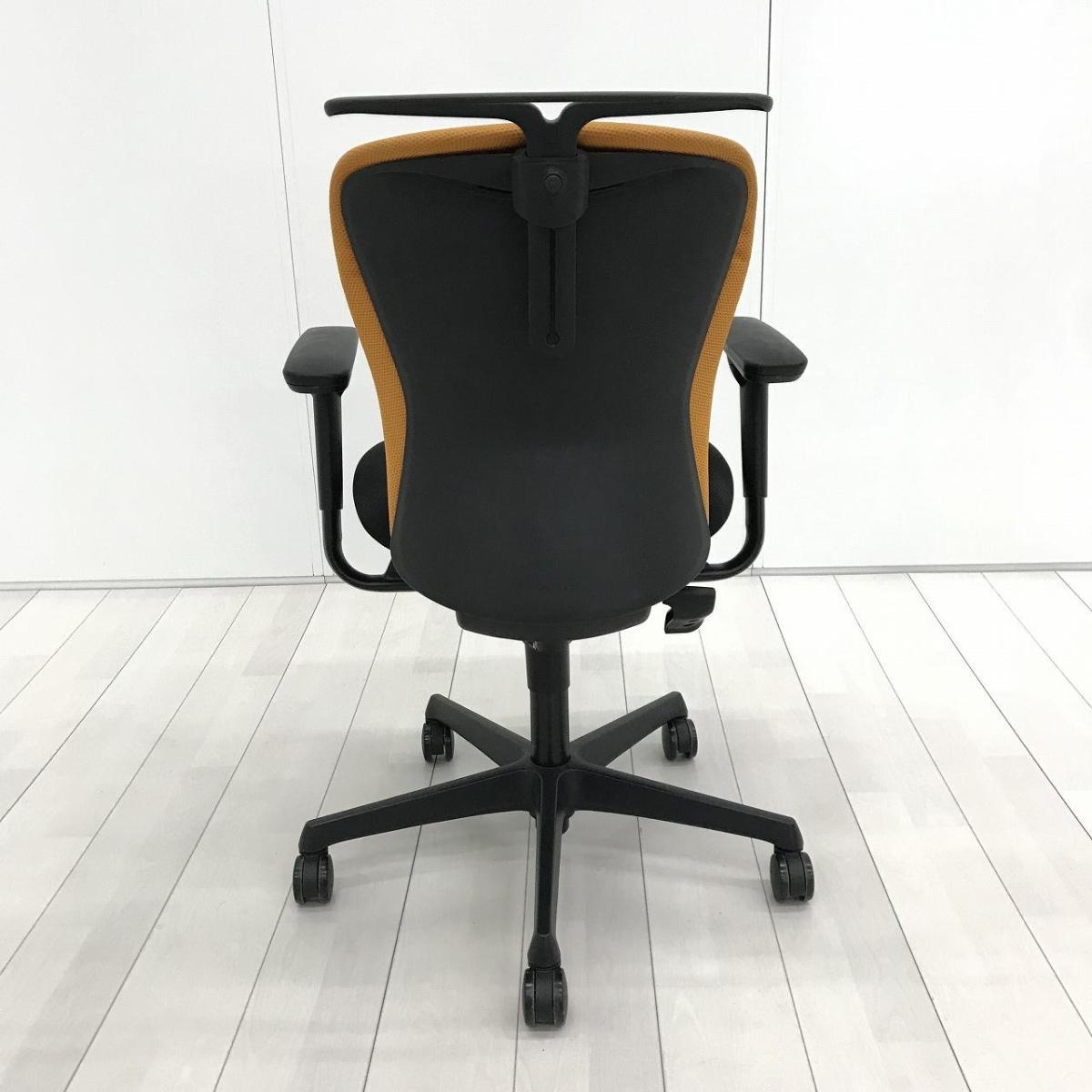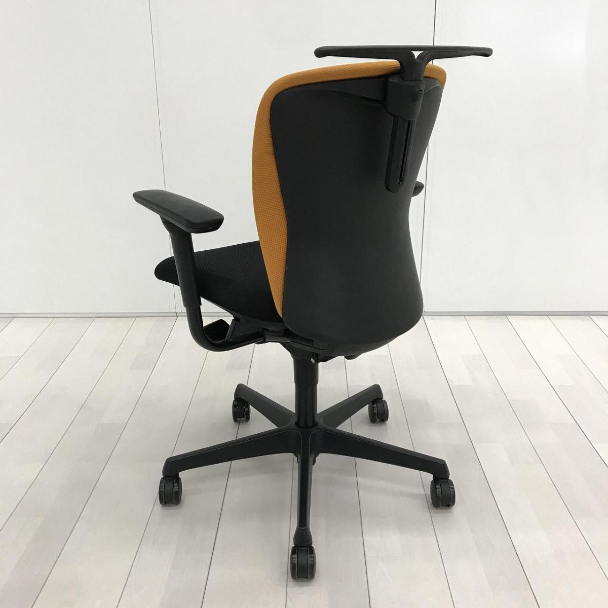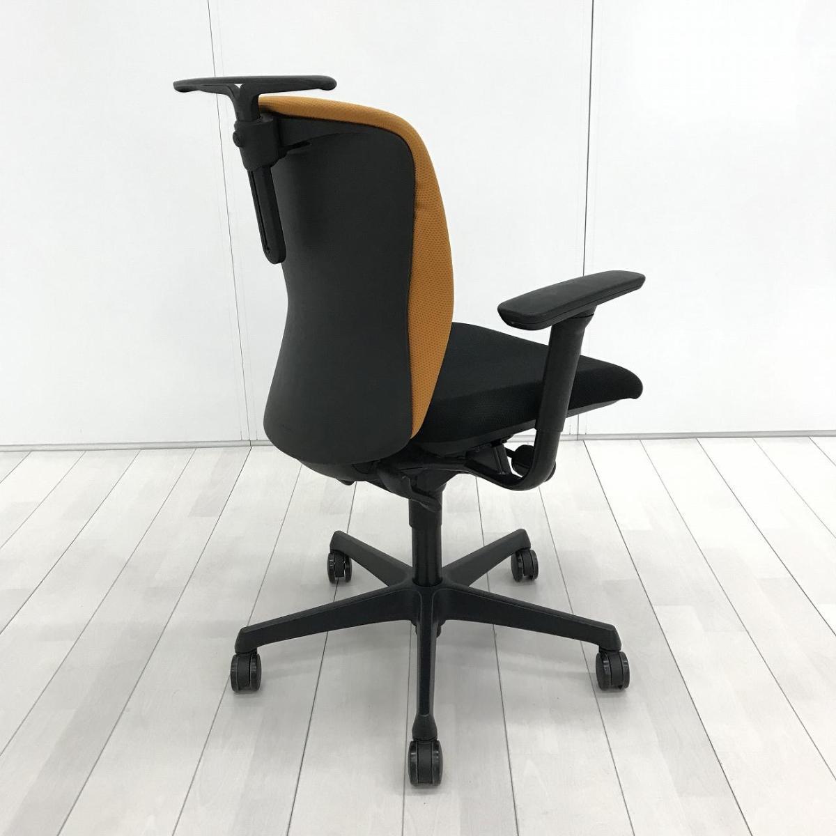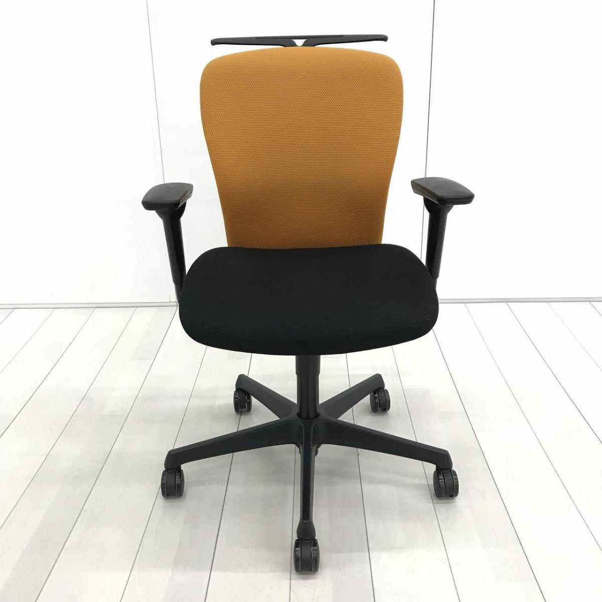 ★【T4】【商品入替のため、残り20脚限り】オカムラ製 スラート オレンジxブラック ブラックフレーム アジャストアーム※可動肘 コートハンガー ローバック シンプルなデザインと厚みのあるクッションが大人気! 機能充実のワーキングチェア! 肘付きローバックチェア!!