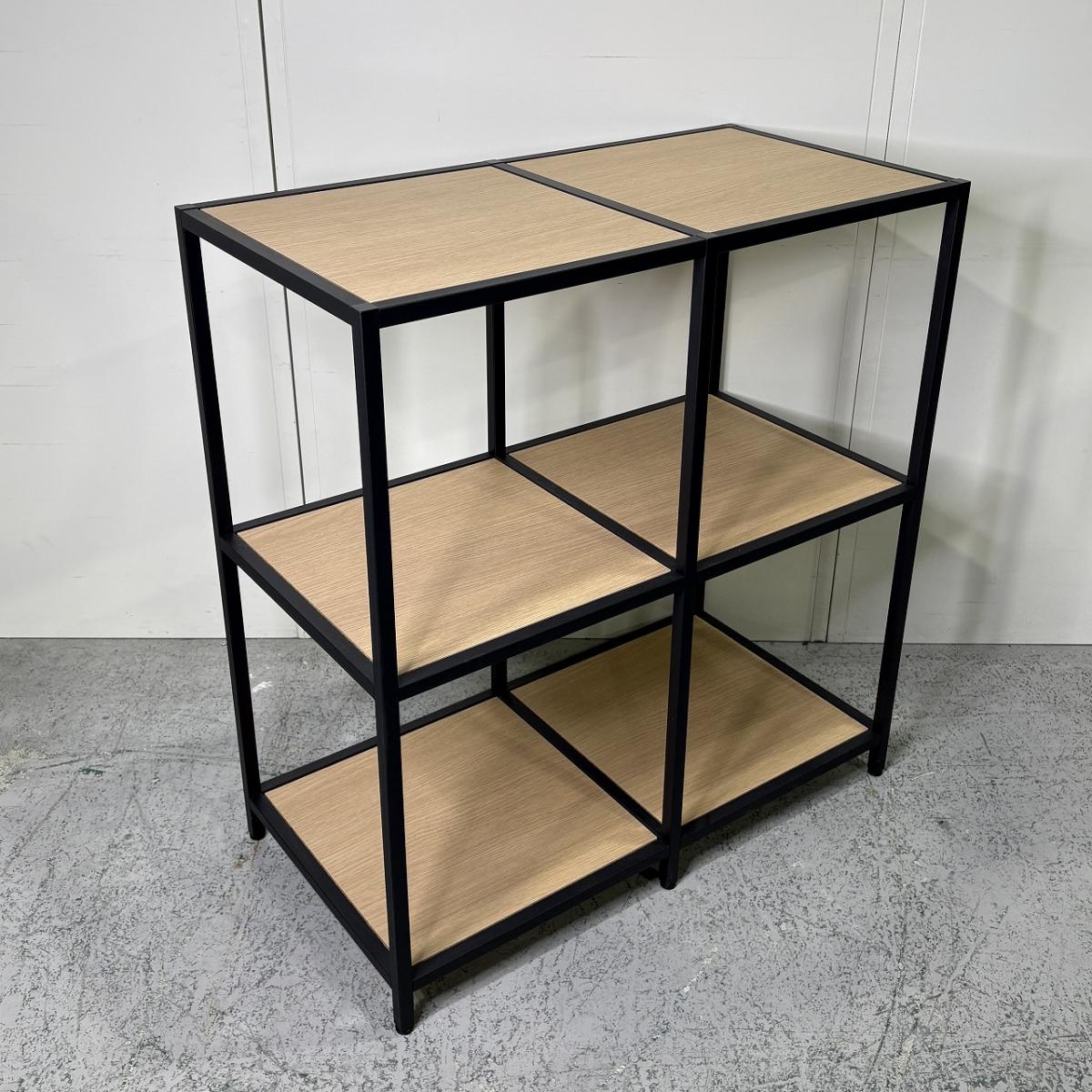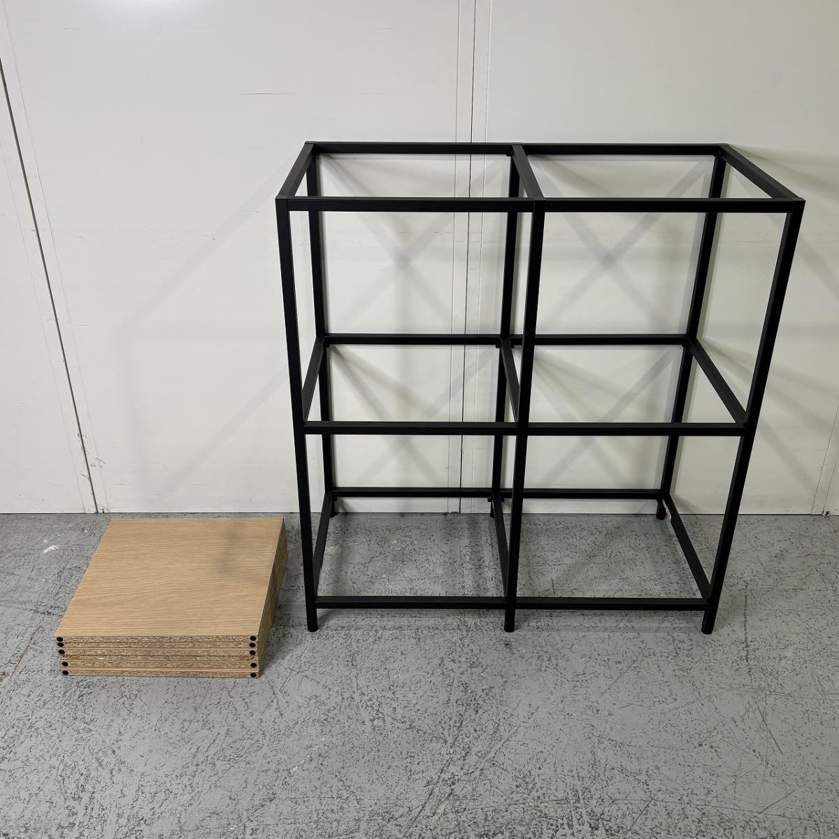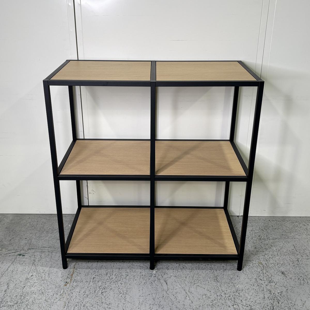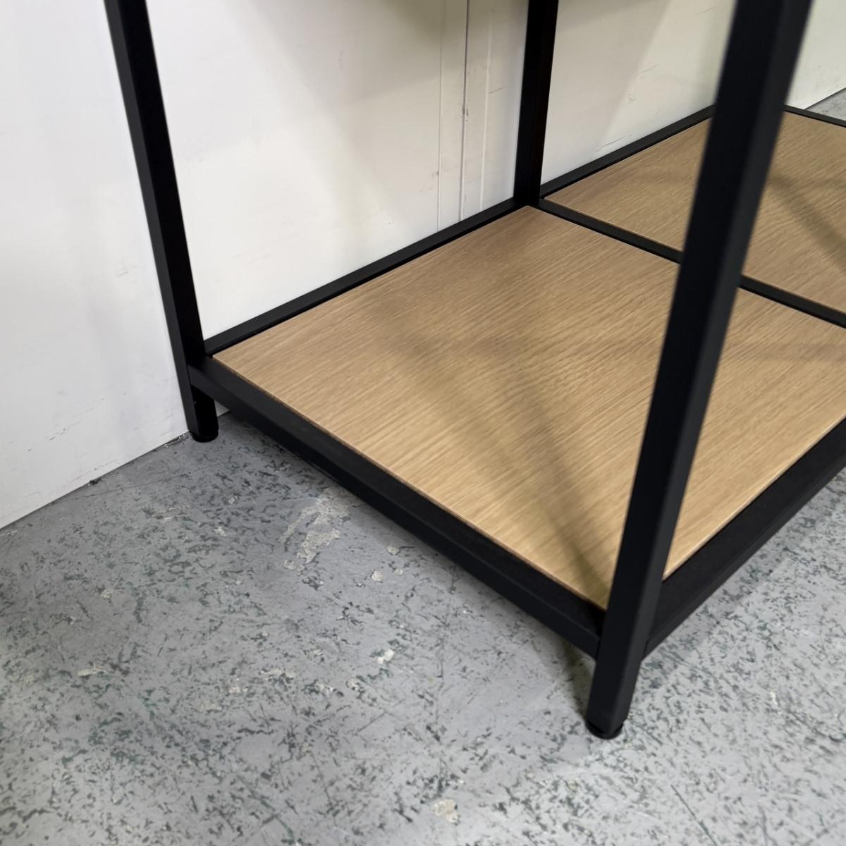 ブラックのスチールフレームとナチュラルな木目棚板の組み合わせが