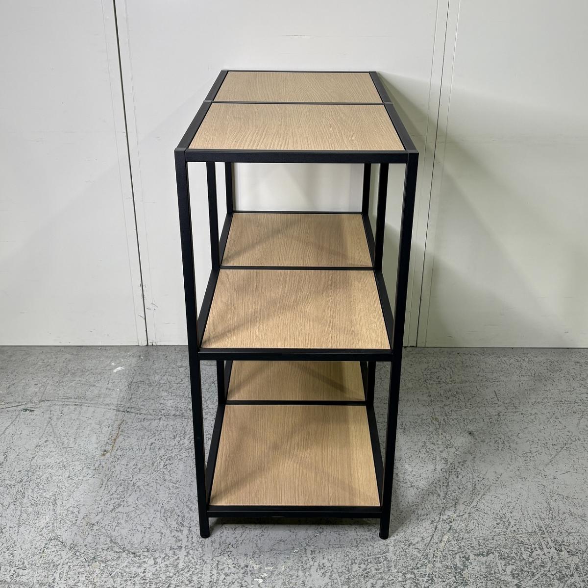 シンプルで洗練されたデザインのスチールフレーム×木目調棚板オープンシェルフです。