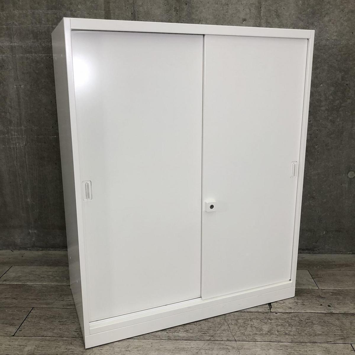 【スライド引き戸だから開閉スペースに困りません!】■オカムラ(okamura)製 レクトラインシリーズ 引違い書庫 2枚引き戸 ローキャビネット W900×D450×H1100mm ■ベース付き ■シリンダー錠 ■ホワイト- 名古屋本店