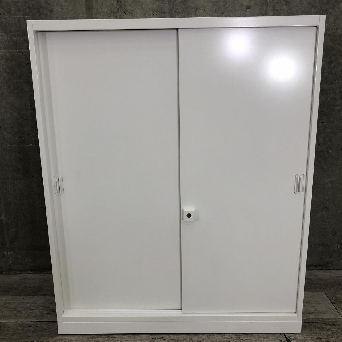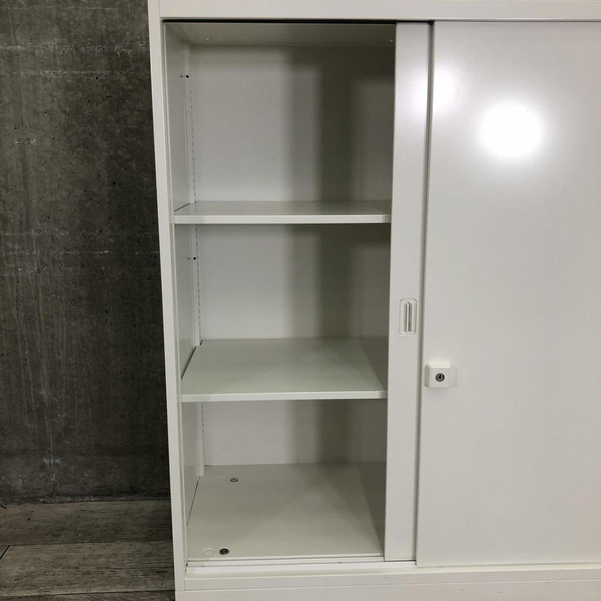 【開閉スペースがいらないので省スペースに最適!】 ■オカムラ(okamura)製 レクトラインシリーズ ローキャビネット 引き違い書庫 ■3枚引き戸タイプ ■シリンダー錠 ■ホワイト