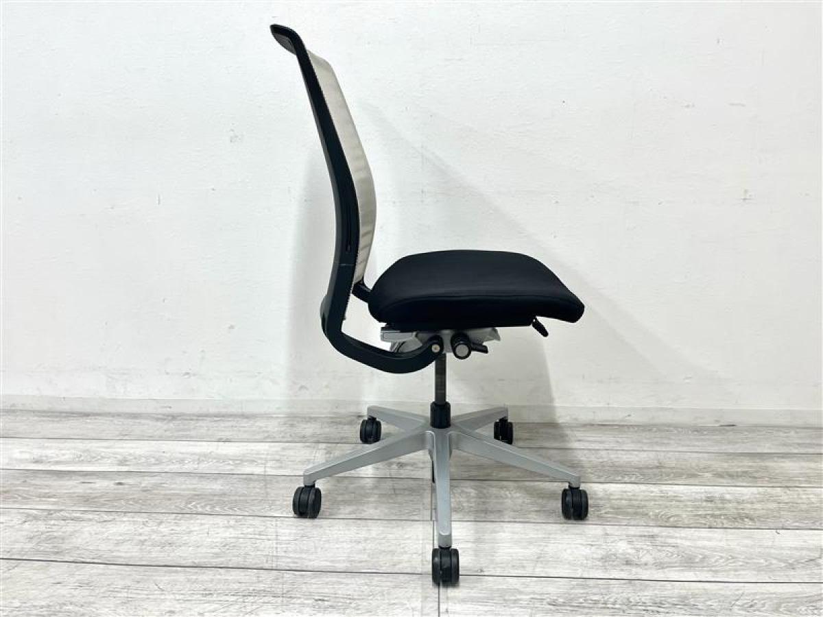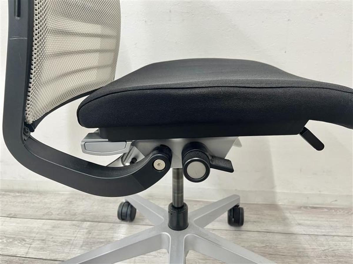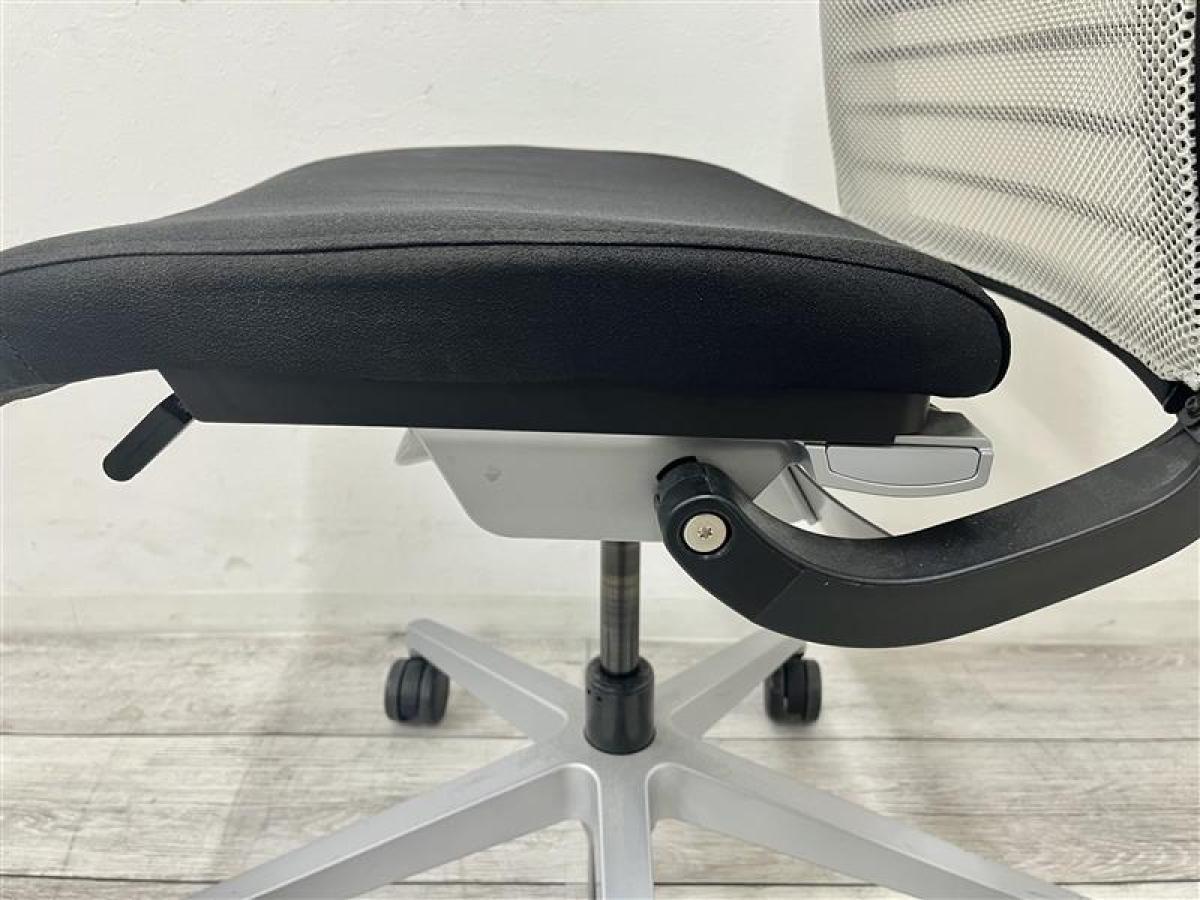 快適な座り心地に不可欠な調節機能である、上下昇降、座面の奥行き調整、リクライニングなどを備えており、操作もわかりやすく好評です。 特に、座面の奥行きは、座面下の左右に通った細いバーで調整でき、座ったままで軽やかに滑るように調整が可能です。 価格面では、新品では高めですが、中古は流通も多く、定価の3割前後の価格で高級チェアの座り心地を手に入れることができます!