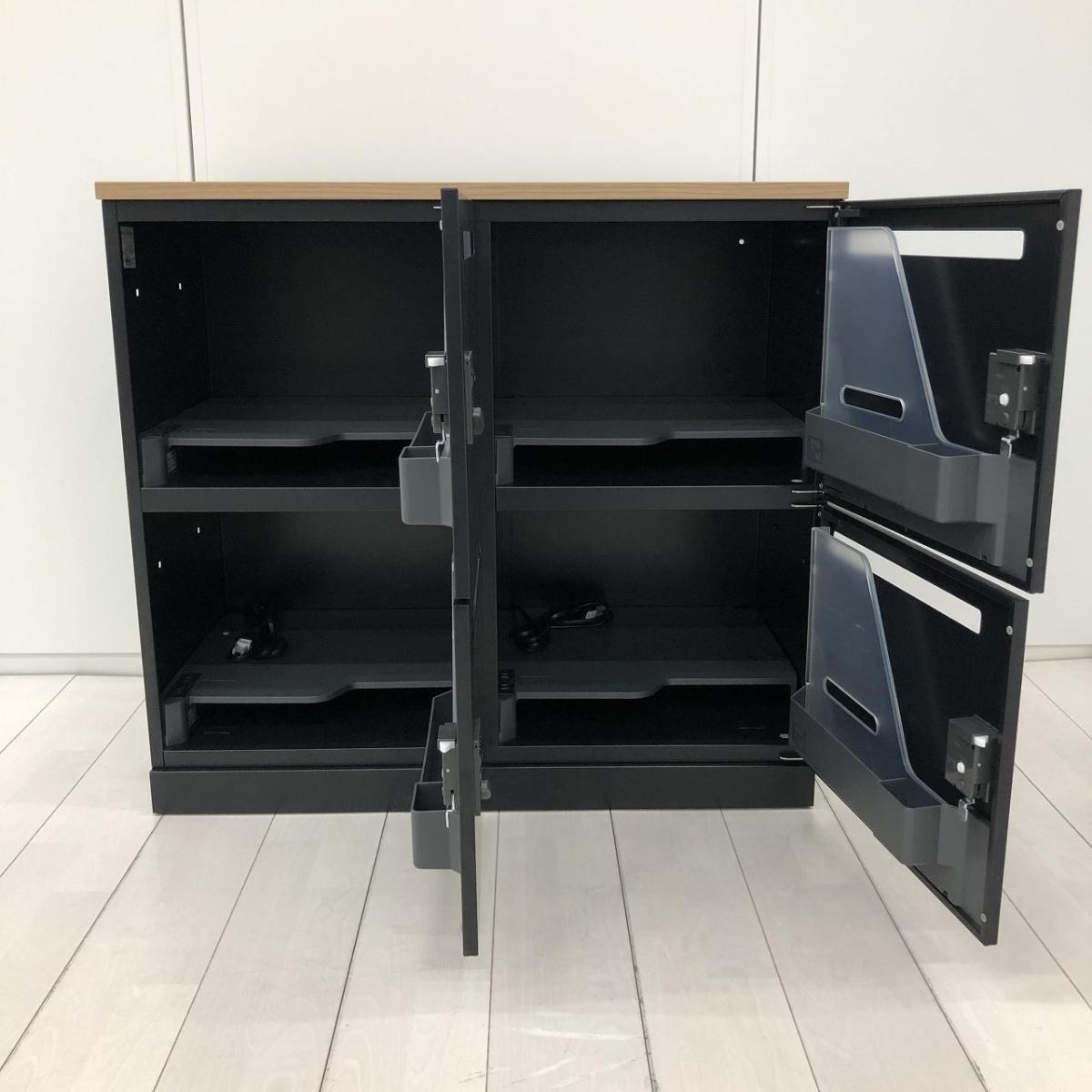 【カフェ調オフィスへリニューアルご検討の方にお勧め!】■コクヨ(KOKUYO)製 イノン(iNON )シリーズ 4人用パーソナルロッカー 庫内仕切りSタイプ 下段オープン H1200mm ■投函口付 ■ダイヤル錠 ■木目天板付×ブラック 【弊社使用欄:A01044111】