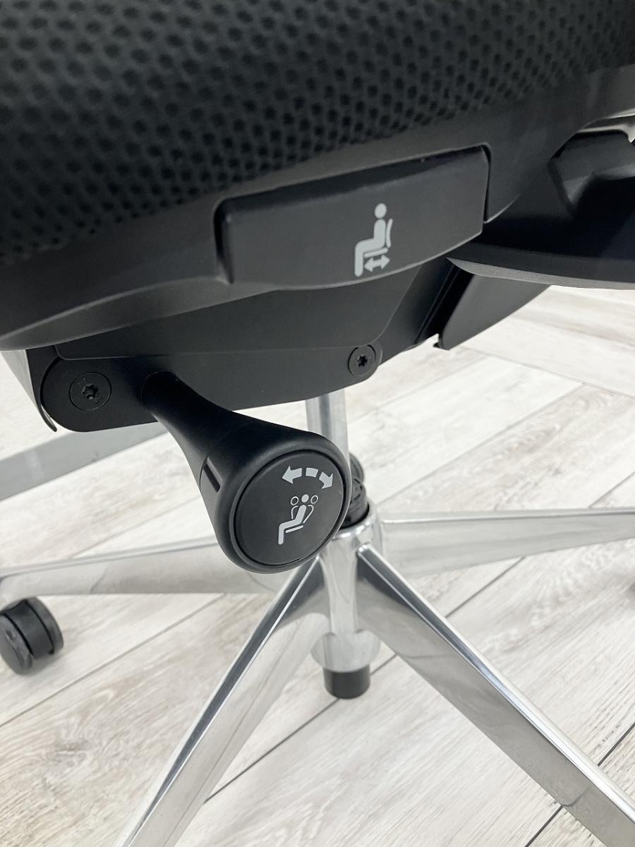 - 座面右下のダイヤル操作で、リクライニングの強弱調整が行えます。これまでのダイヤル式よりも、少ない回転数で、最弱?最強の調整が可能です。