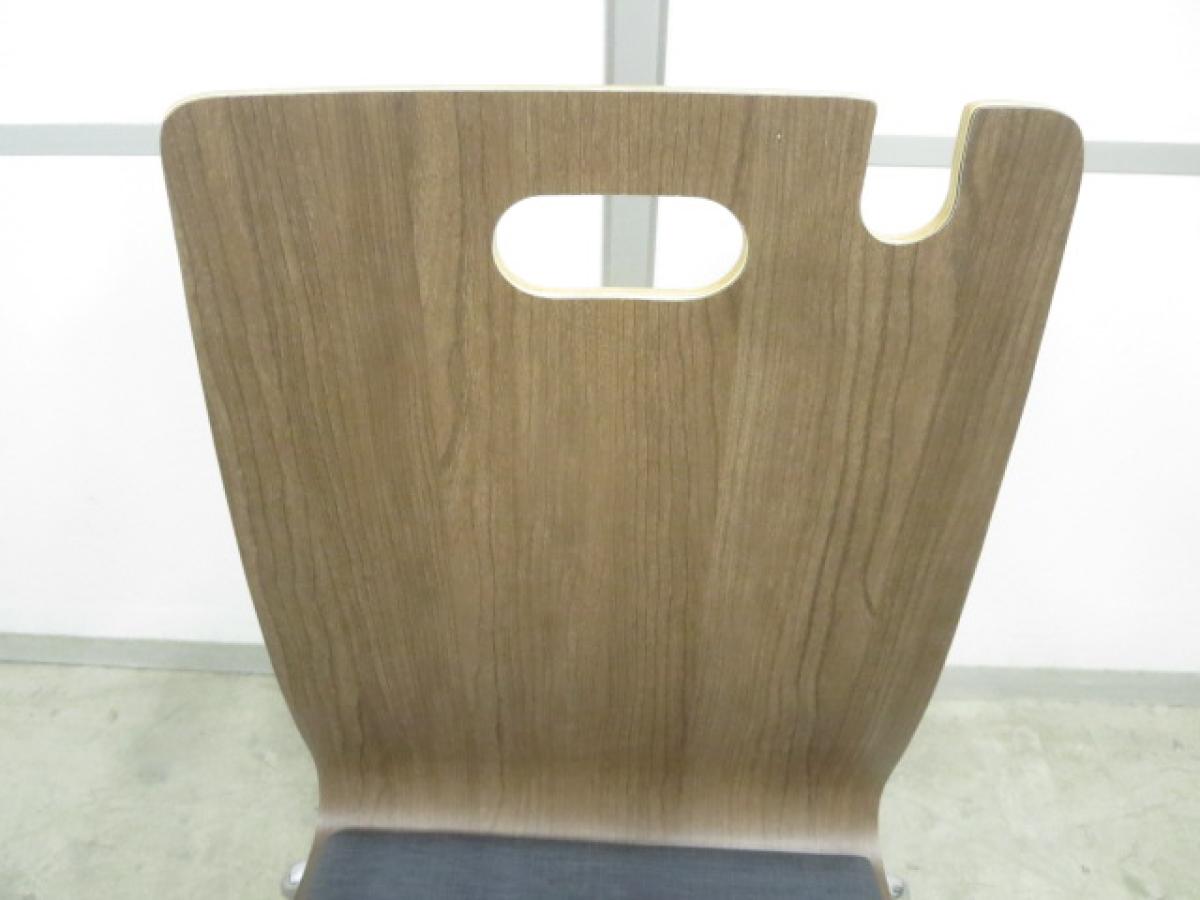 【荷物が掛けられる機能的なデザイン!】■スタッキングチェア 背:木目ブラウン 座:ブラック(レザー) ■いま流行りの木目デザイン!便利な持ち手付!カフェスペースにフィット!【ABW】- 川崎店