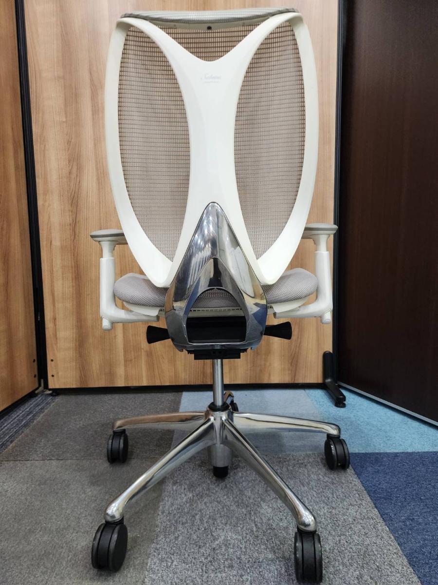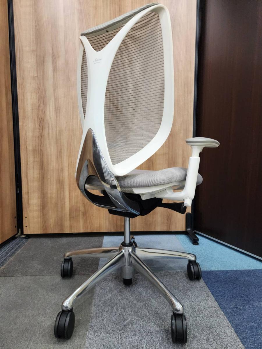 【前傾機能で作業効率アップ!安定感のある座り心地で大好評!ご自宅用にもオススメ!】■オカムラ(okamura)製 Sabrina(サブリナ) ハイバック 肘付き ■背面メッシュ ■可動肘 ■ライトグレー × ホワイトフレーム- 名古屋本店