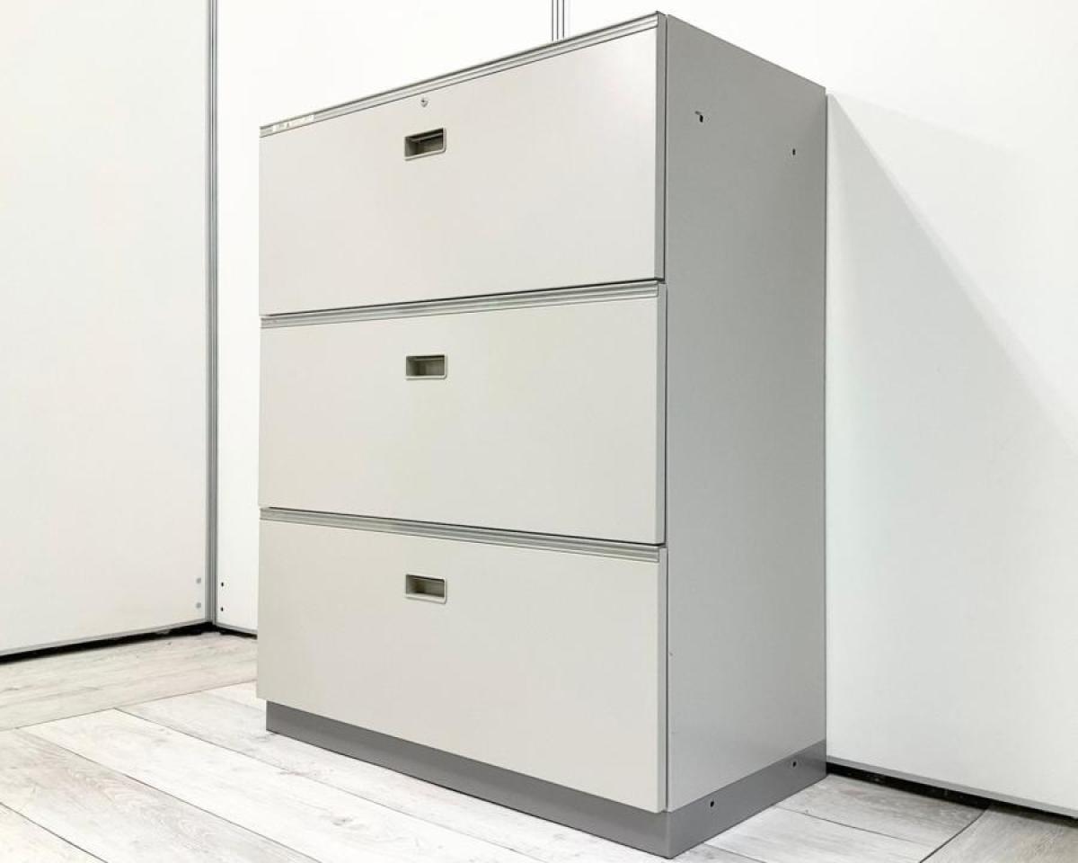 【A4ファイルも沢山収納可能!人気の3段引き出し式キャビネット!】■イトーキ(ITOKI)製 シンライン(THIN LINE)シリーズ 3段ラテラル書庫 ローキャビネット H1100㎜ ■シリンダー錠 ■ニューグレー