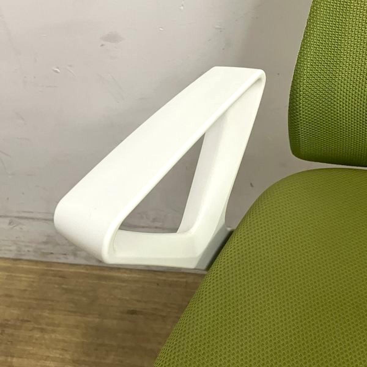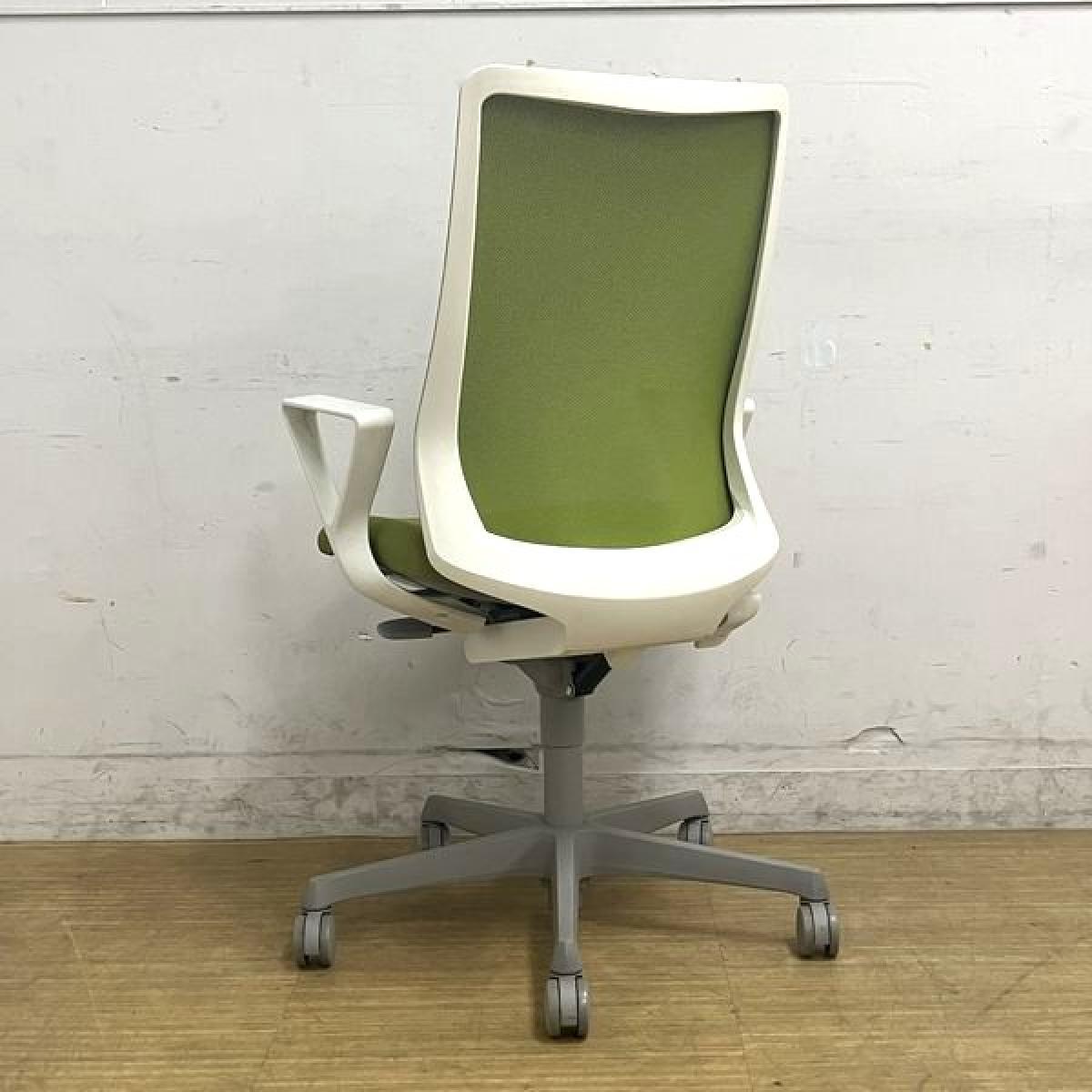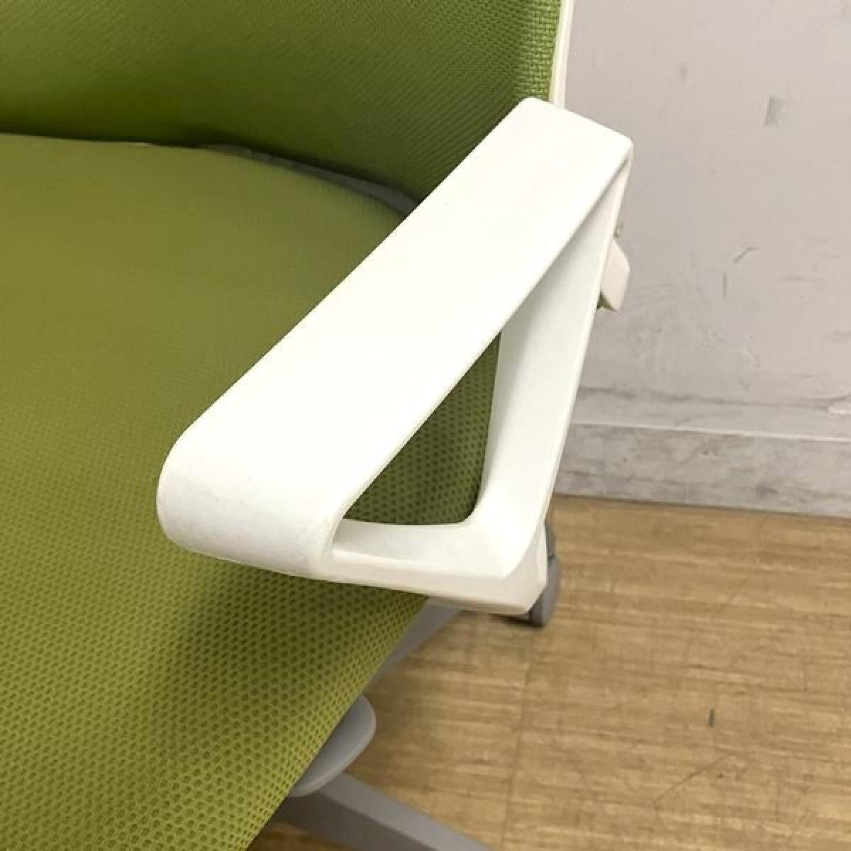 ★【T4】【T3】【商品入替のため、残り6脚限り】オカムラ製 フルーエント グリーン ホワイトフレーム 肘付き ハイバック 背面メッシュ デザインアーム※固定肘 腰まわりをしっかりホールド! 長時間作業も快適フィット! 肘付きハイバックチェア!!
