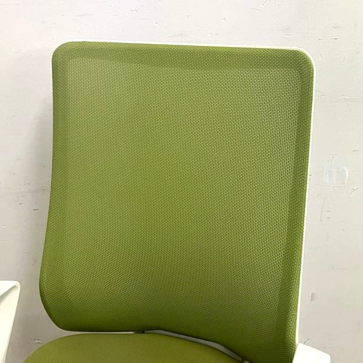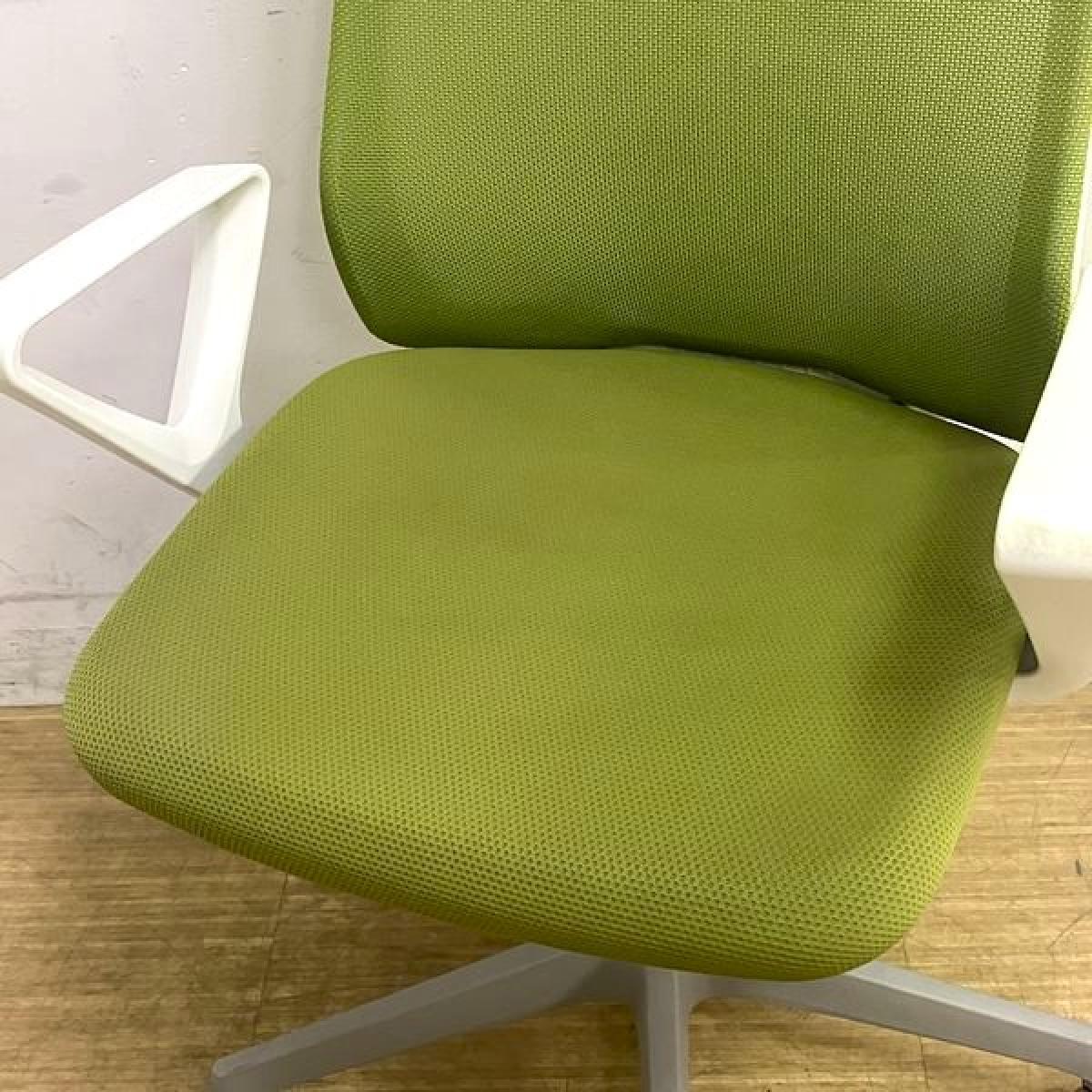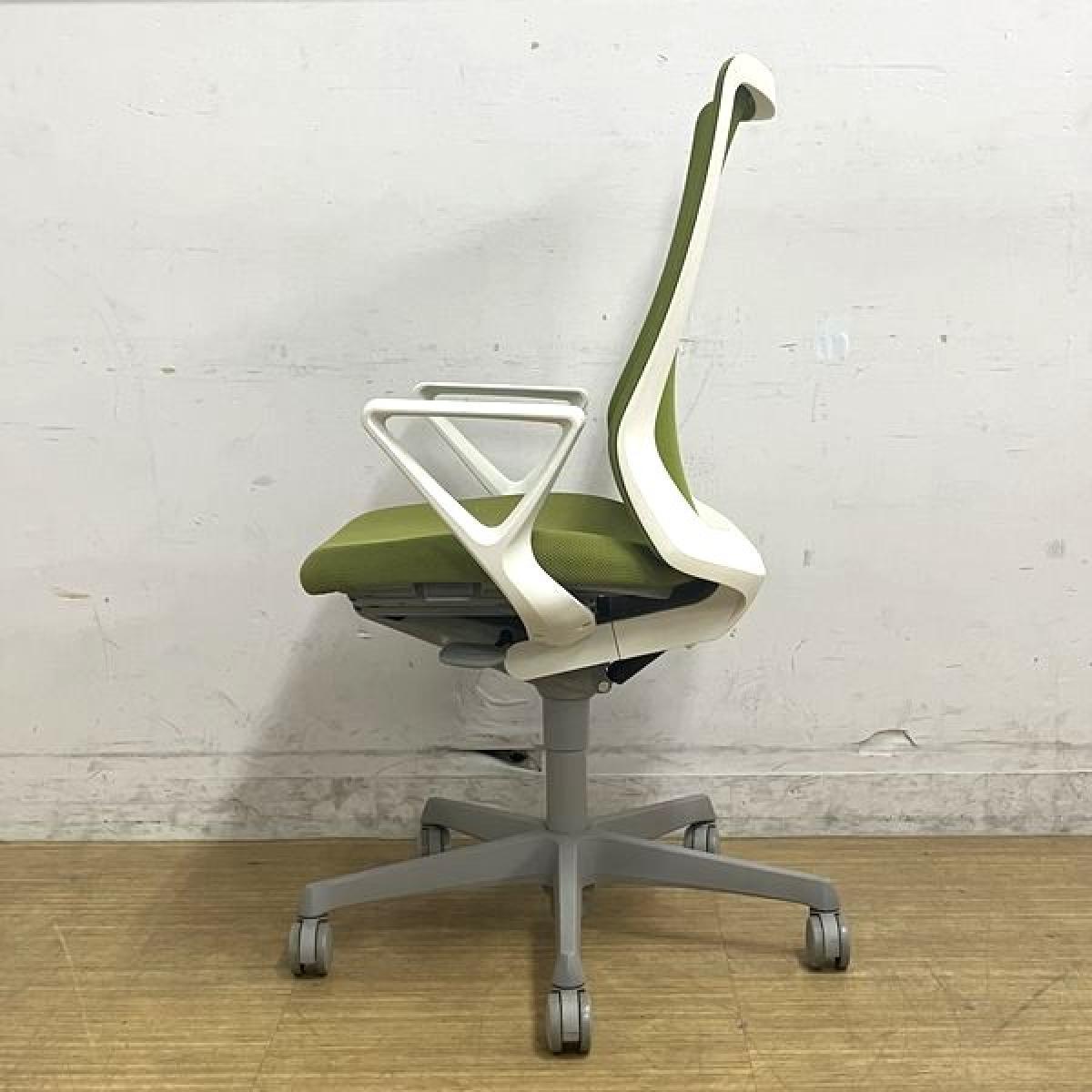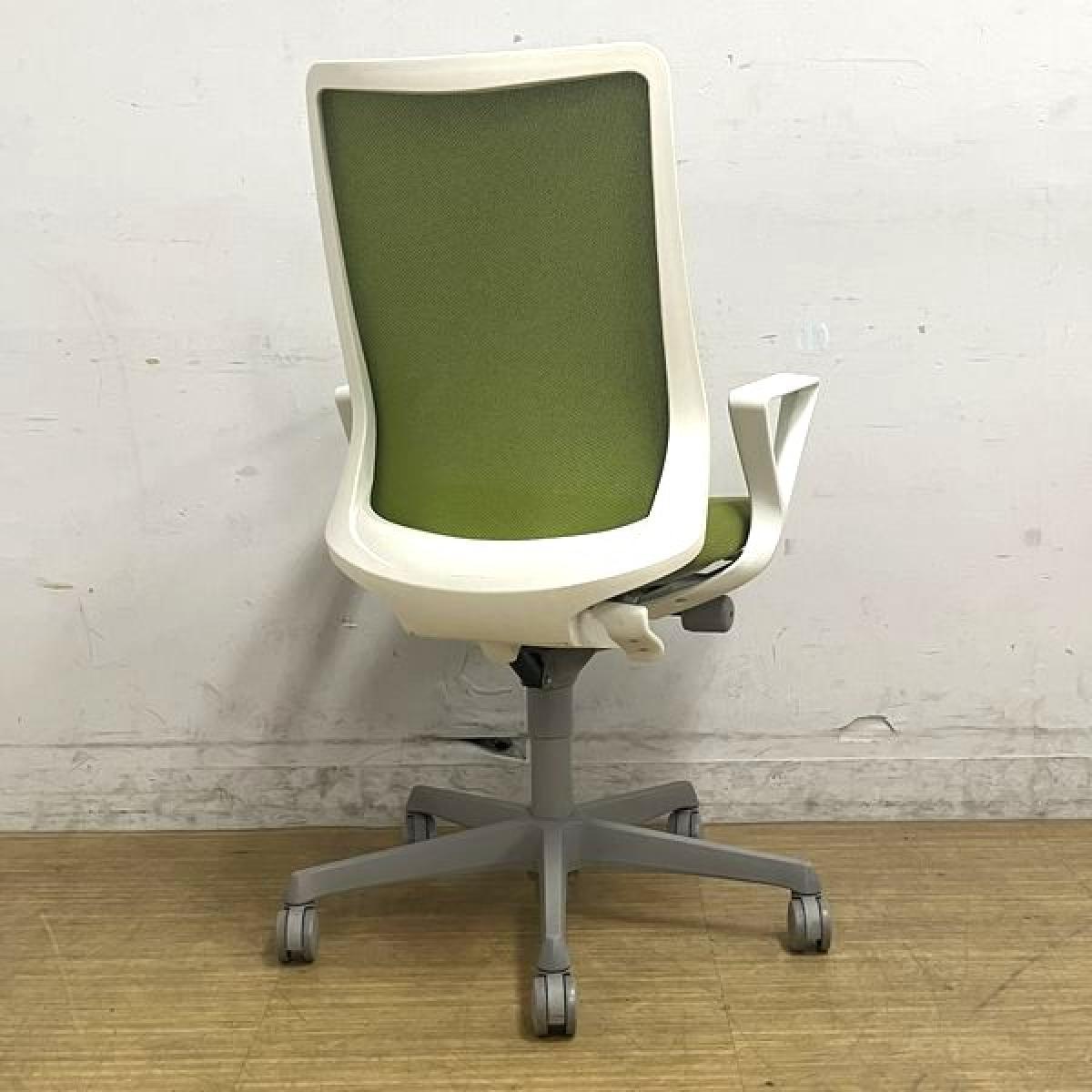 ★【T4】【T3】【商品入替のため、残り6脚限り】オカムラ製 フルーエント グリーン ホワイトフレーム 肘付き ハイバック 背面メッシュ デザインアーム※固定肘 腰まわりをしっかりホールド! 長時間作業も快適フィット! 肘付きハイバックチェア!!