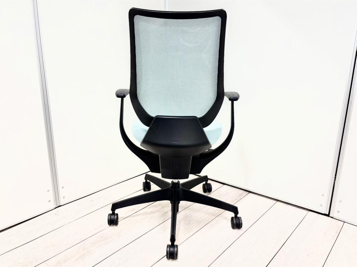 【定価約16万円】【イスとひとつになれる新感覚!360°揺れて体を自由に動かせる「グライディング・メカ」搭載!】■コクヨ(KOKUYO)製 イング(ing)チェア 肘付ハイバック 背面メッシュタイプ ■固定肘・ハンガー付き ■アッシュターコイズ×ブラックシェル
