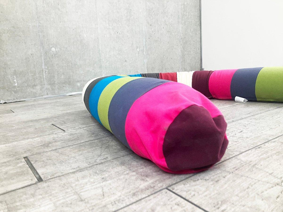 カラフルなデザインが特徴的な、Yogiboのロングタイプクッション「キャタピラー ロール ロング」です。