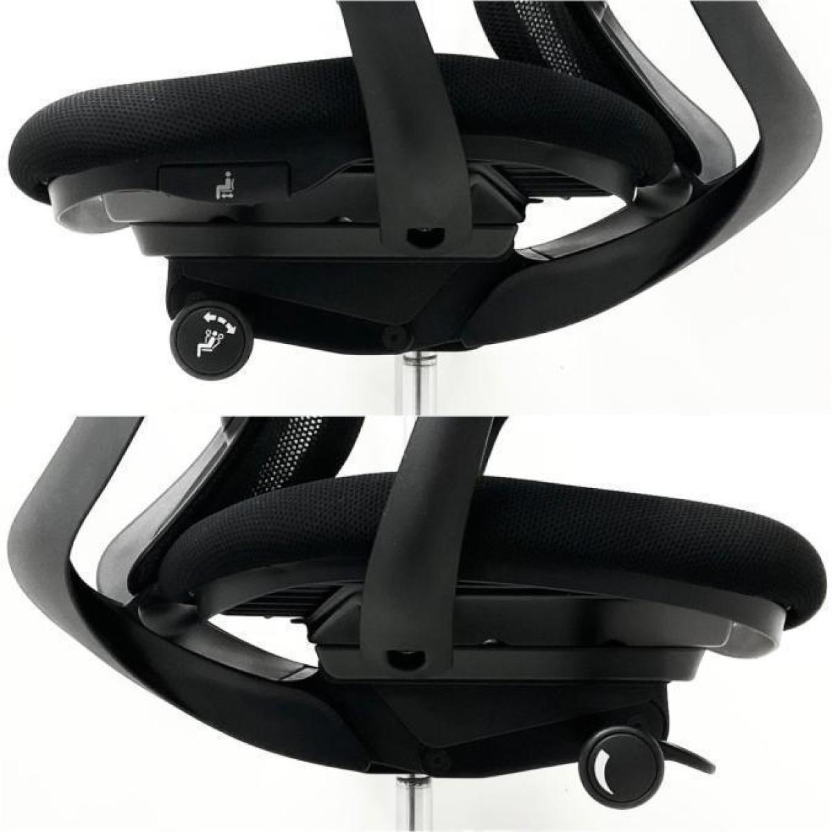 - 座面左下のダイヤルでリクライニングの固定と解除が行えます。 前傾ポジションをとることも可能です。