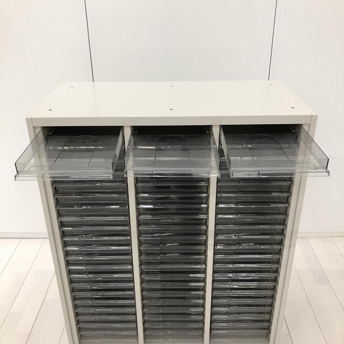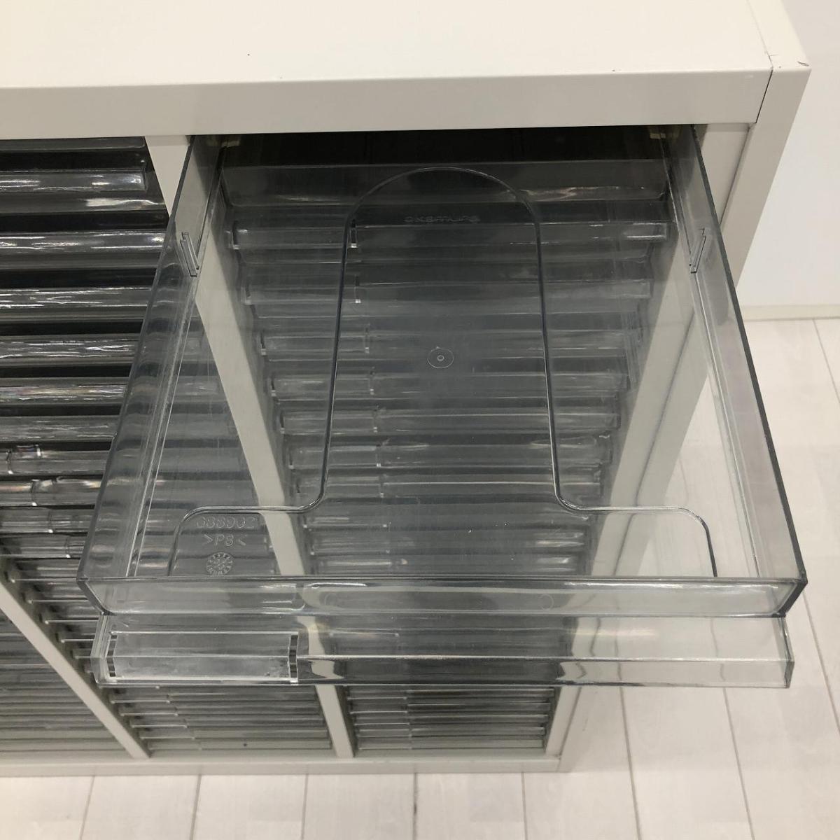 【書類・備品整理の必需品!収納力抜群!】■オカムラ(okamura)製 42 50Hタイプシリーズ クリスタルトレイ W900×D450×H1100㎜ ■(3列x22段)トレー数66 ■天板付き ■ライトスモーク