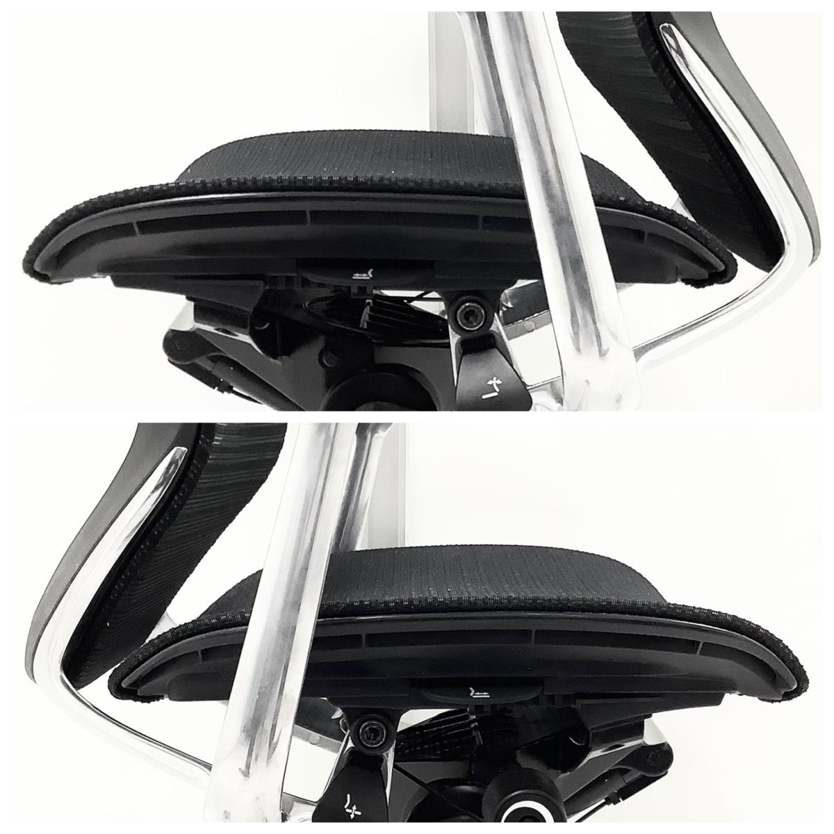 もちろん座り心地もコンテッサの直系ですから快適です。座面の素材はクッションとメッシュの2タイプあります。私、個人的には座面の中心部分でも外側でもテンションが変わらないクッション素材が、足を閉じても開いても快適なので推しです!"
