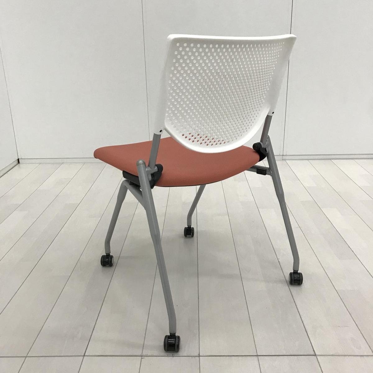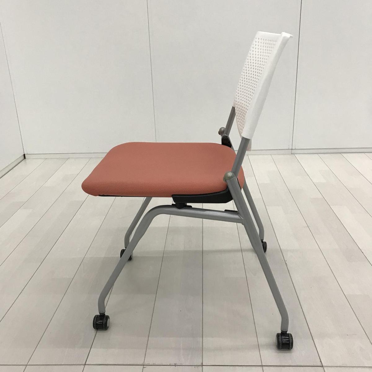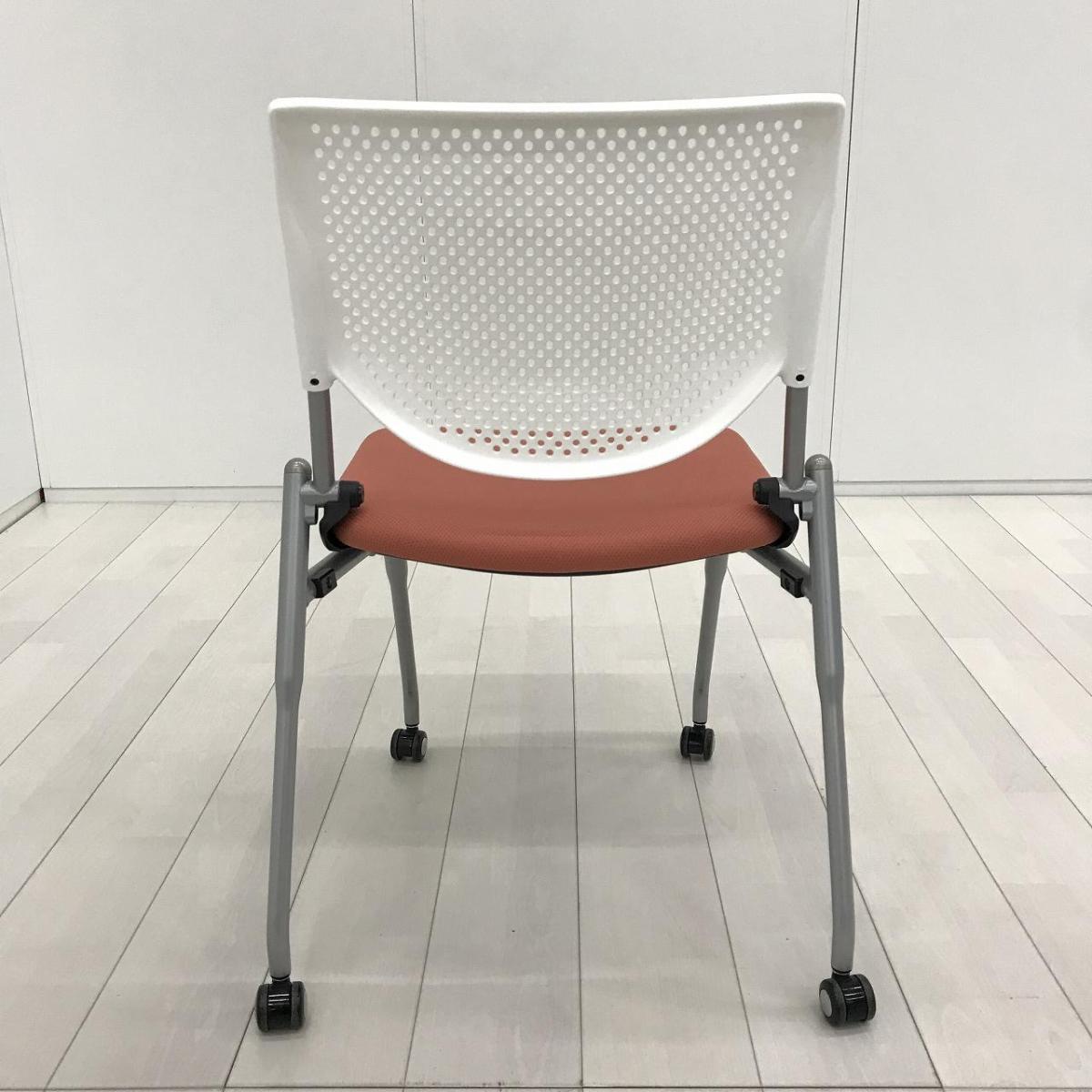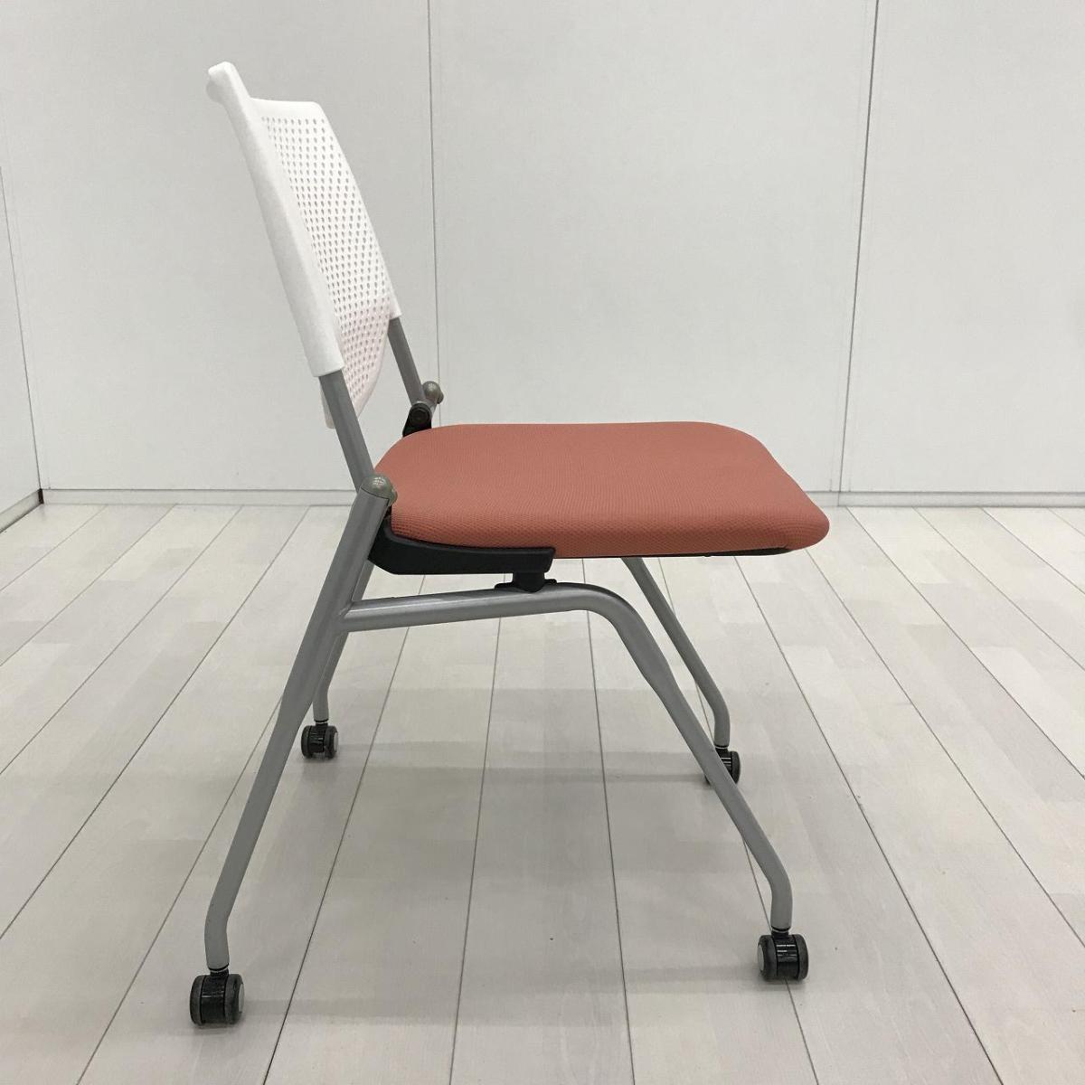 【ポップなデザインでコミュニケーションも活性化!】■オカムラ プロスタックシリーズ ネスティングチェア ピンクとオレンジの中間くらいの色合い ホワイトシェル 背面樹脂メッシュ ミーティングチェア【ABW】A01072652- 川崎店
