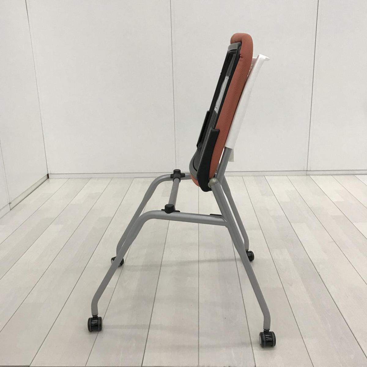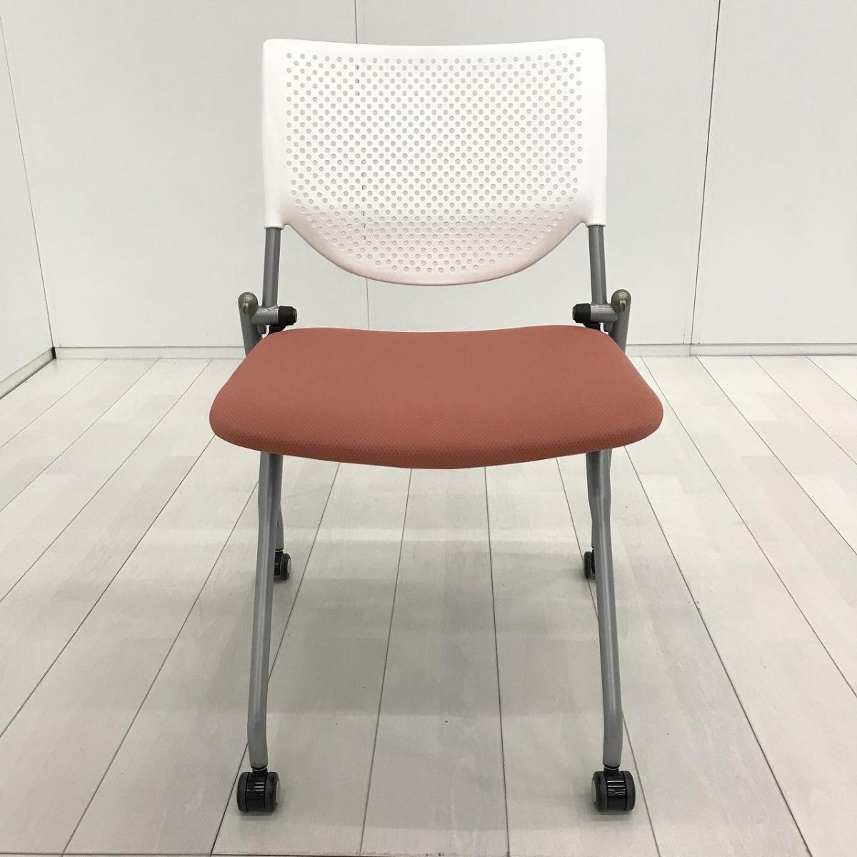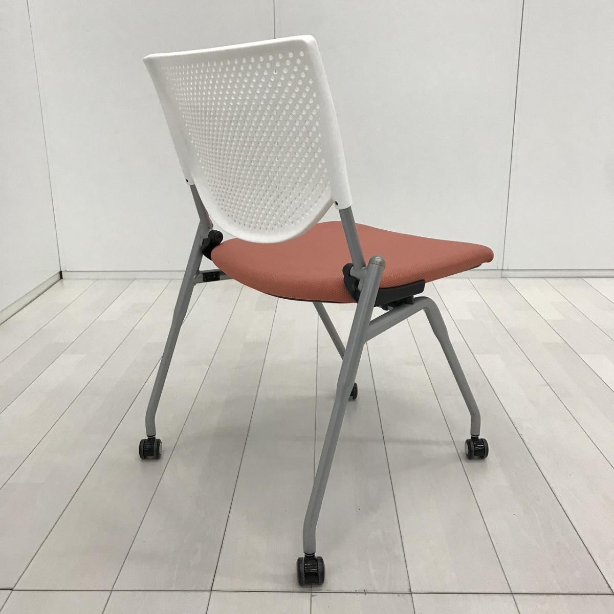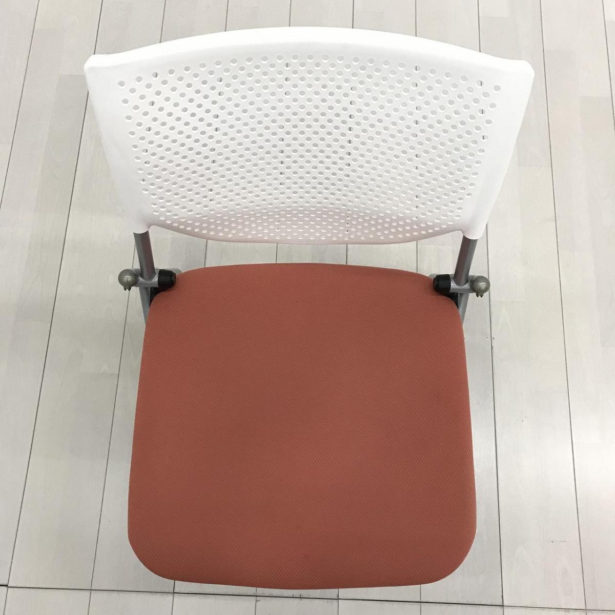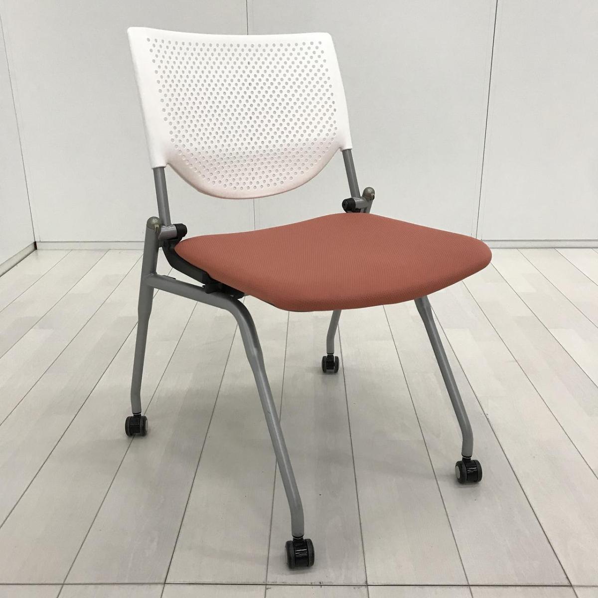 【ポップなデザインでコミュニケーションも活性化!】■オカムラ プロスタックシリーズ ネスティングチェア ピンクとオレンジの中間くらいの色合い ホワイトシェル 背面樹脂メッシュ ミーティングチェア【ABW】A01072652- 川崎店