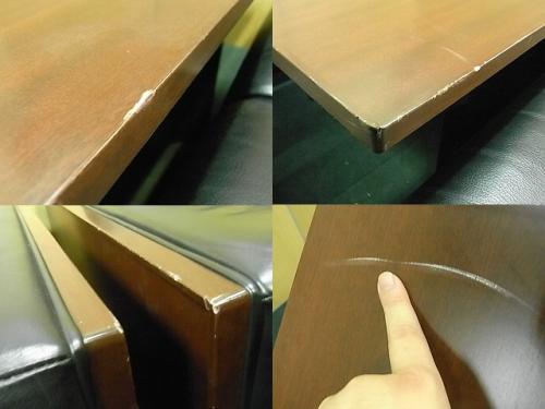 - 目立つ箇所複数ありソファの場合、深い破け、ホツレ、へたり、しわ等が多数ある。(例、背もたれ、肘かけ、座面等にある。)センターテーブルの場合、深い傷・凹みが商>品全体にある。(例、天板、脚にある。)