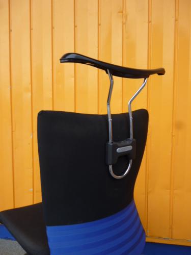 - 背もたれの裏側にハンガーがついているので上着などを形よく掛けられ、袖や裾が床に付きにくくなります。